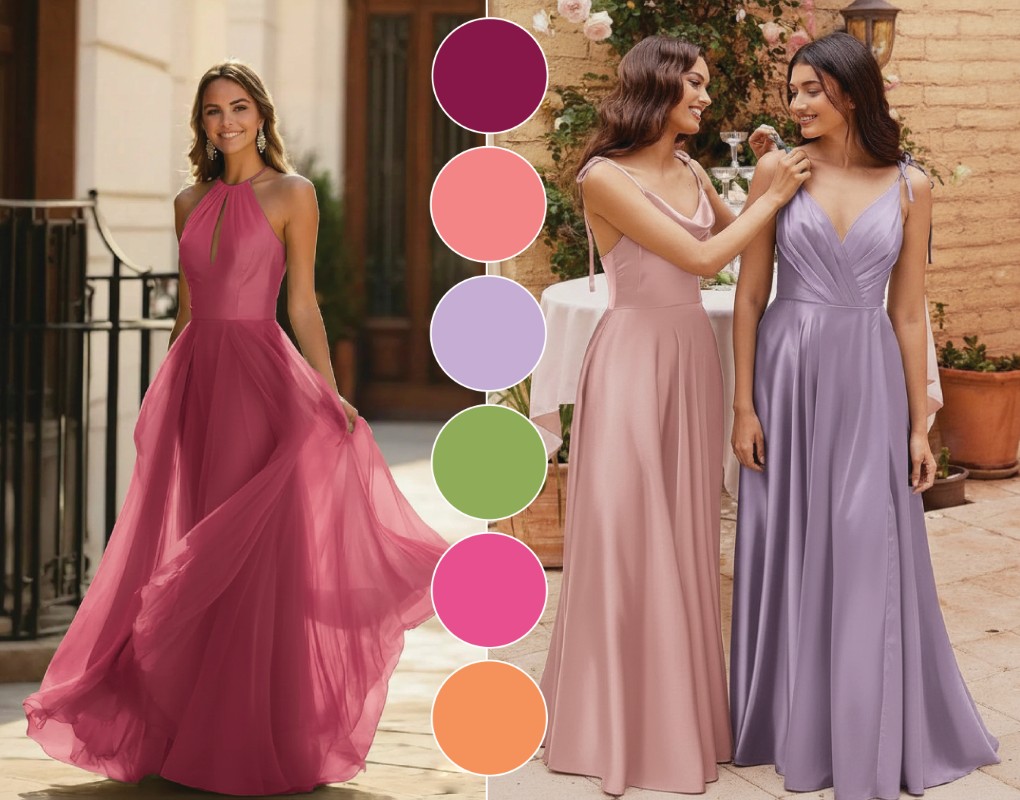 Opta por vestidos frescos y ligeros, en telas vaporosas (lino, seda, gasa o algodón). Colores suaves o florales: piensa en tonos pastel y tonos sólidos. Evita el blanco, rojo y negro, estampados florales muy llamativos. Aquí te dejamos una paleta de colores si no sabes muy bien qué colores usar y algunos ejemplos. El diseño será según te convenga más, queremos que estés cómoda y te sientas hermosa.